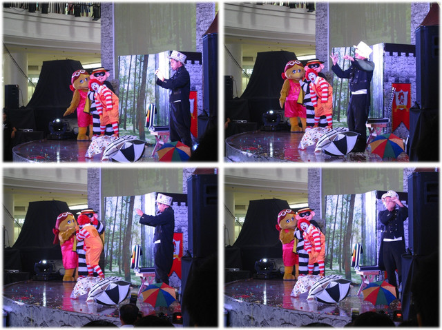 逗趣的麥當勞叔叔... 跟著台下小朋友一同看魔術表演... 真是搞笑十足!!